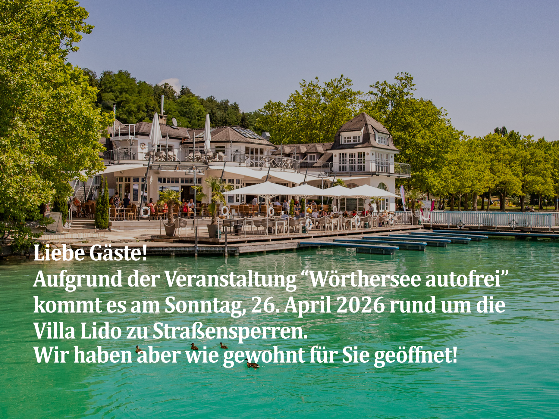 Liebe Gäste! Aufgrund der Veranstaltung “Wörthersee autofrei” am 26. April 2026 kommt es rund um die Villa Lido zu Straßensperren. Wir haben aber wie gewohnt für Sie geöffnet!