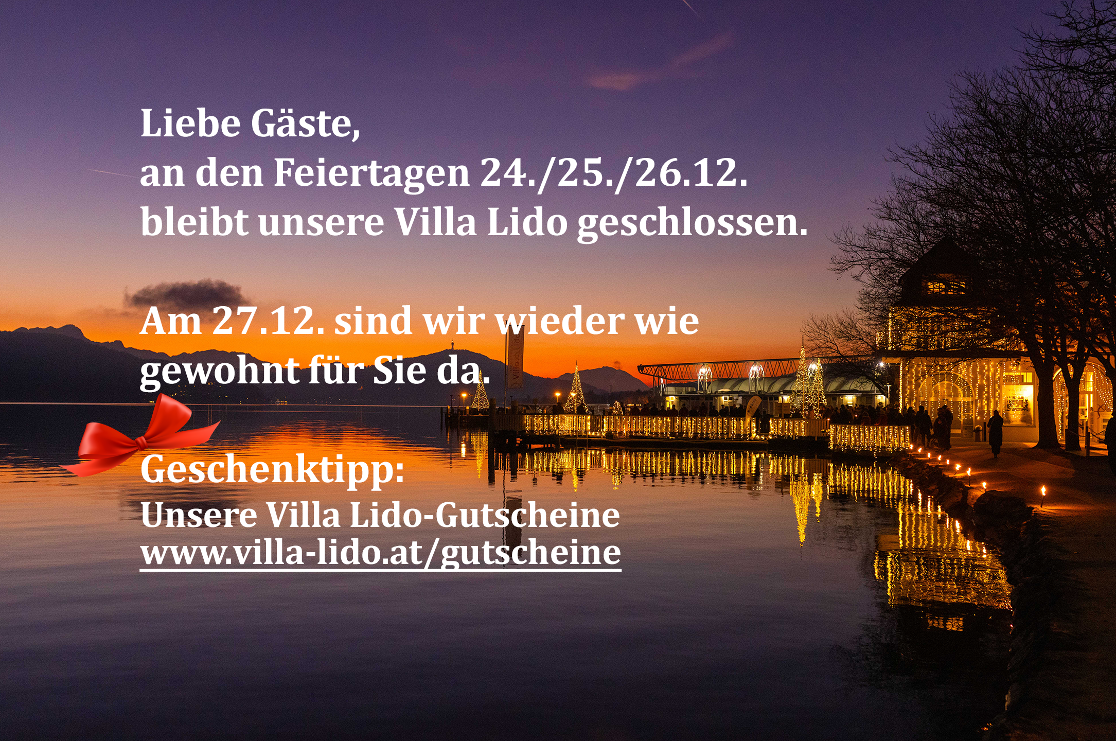 Diese Website wird von der Villa Lido GmbH, FN 182601g, Friedelstrand 1, 9020 Klagenfurt am Wörthersee, betrieben. Diese Mitteilung beschreibt, wie Ihre personenbezogenen Daten im Zusammenhang mit dieser Website verarbeitet werden.